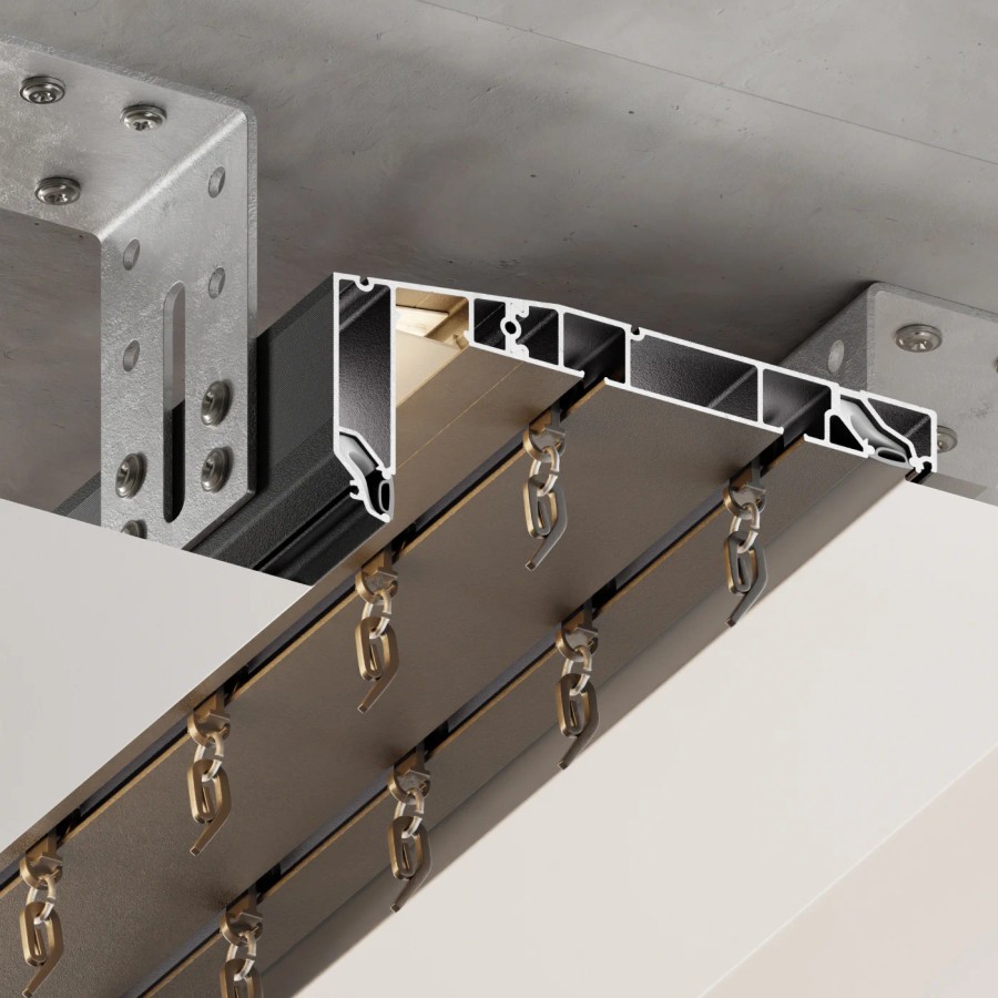 Профиль для изготовления скрытых карнизных ниш с двумя пазами под установку штор и тюля. Увеличенная глубина и расстояние между камерами 45 мм обеспечивают плавный и бесшумный ход бегунков. Пазы под гарпун закрываются PVC-вставкой.