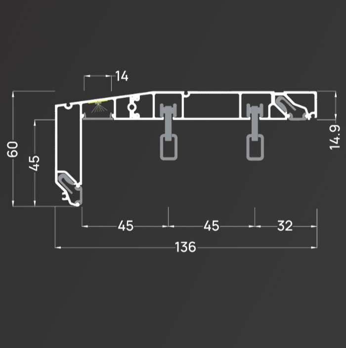 Профиль для изготовления скрытых карнизных ниш с двумя пазами под установку штор и тюля. Увеличенная глубина и расстояние между камерами 45 мм обеспечивают плавный и бесшумный ход бегунков. Пазы под гарпун закрываются PVC-вставкой.